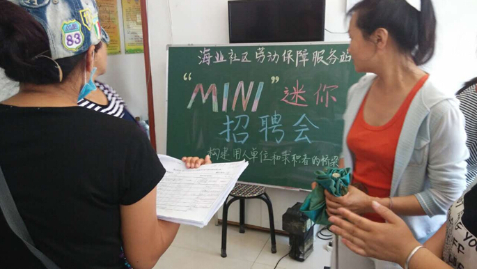为了深化解决辖区内就业问题,给予求职者和招聘单位搭建沟通的桥梁。海业社区劳动保障服务站研究本社区内就业形势,分析人力资源平台数据库,走访辖区内中小企业和商户并大量搜集招聘信息,开展了招聘活动。因为提供岗位的用人单位均是中小企业和商户自于本辖区,具有信息的时效性以及工作地点和时间较方便等特点,因此海业社区将此次特色招聘活动定义为了“MINI”迷你小型招聘会。